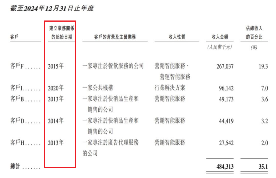 從數據上看,新的趨勢已經對明略科技的營收帶來了衝擊。2024年,其五大客户共貢獻了4.84億元,同比減少7.98%。值得注意的是,其中的四家公司都是在2015年之前建立的合作關係,僅有一家是2020年的新合作。
