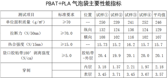 另一款產品PBAT(聚己二酸/對苯二甲酸丁二酯)與PLA(聚乳酸)共混的氣泡袋,雖然其抗拉斷力性能達標,但單位面積質量達到246g/m2,在包裝減量化方面處於劣勢;而且其耐穿刺性能偏低,難以承載重物或異形件,限制了其使用範圍。