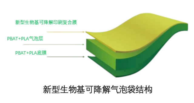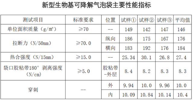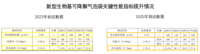測試數據顯示,採用了生物基可降解印刷複合膜材的新型氣泡袋,其單位面積重量減少約20%,直接降低材料成本;同時熱合強度提升約128%,性能遠超國標要求。