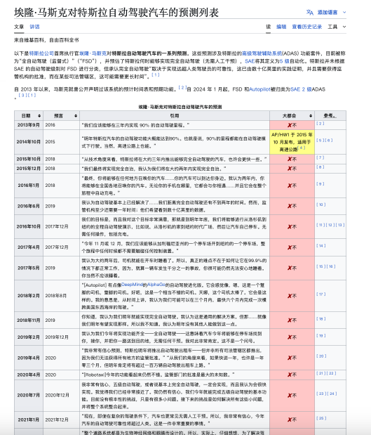 維基百科上有一個“埃隆·馬斯克對特斯拉無人駕駛汽車的預測列表”,羅列了馬斯克的21項明確了時間的承諾,並表明是否已經實現。其中 19 項他未能實現,它們都被標記為難看的紅色。