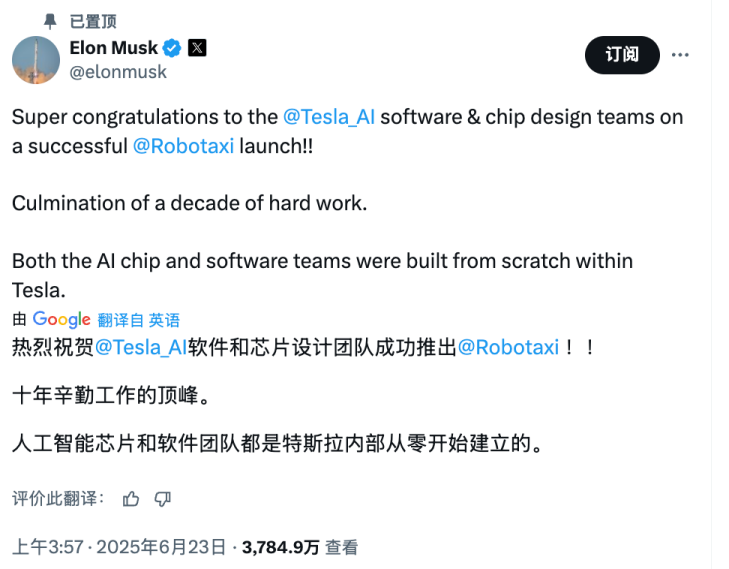 “熱烈祝賀@Tesla_AI和芯片設計團隊成功完成Robotaxi的落地!**這是十年辛勤工作的頂峯。**AI芯片和軟件團隊都是特斯拉內部從零開始創建的。”馬斯克在X(原推特)上如是表示。