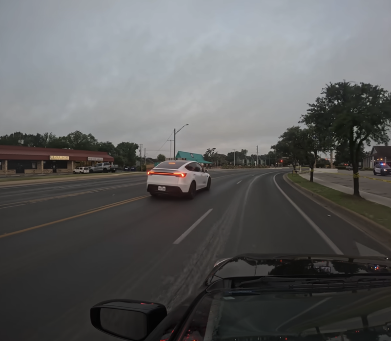第三起事件則由另一輛車拍攝。畫面顯示,特斯拉自動駕駛出租車在經過閃爍警燈的警車時,曾兩次在道路中間突然停車。