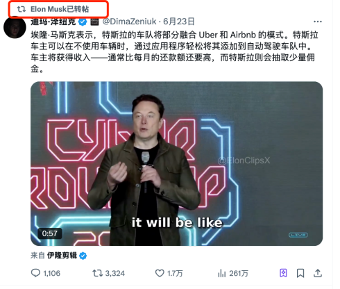 馬斯克並沒有停止畫餅。在X上,他轉發了別人發佈的一段視頻,其中是去年6月馬斯克在特斯拉股東大會上的發言,稱Robotaxi未來是車輪上的Airbnb——車主睡大覺的時候可以讓車出去自己拉活,豈不美哉?