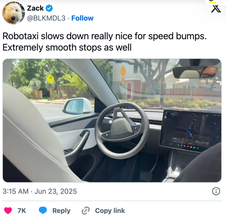 有用户隨車到達星巴克時,遇到了一位停在停車場中間的人類司機。猶豫了一會兒之後,Robotaxi決定掉頭倒車進入停車位,好讓他下車。還有用户驚歎於Robotaxi通過多點轉彎駛出狹窄的停車場。