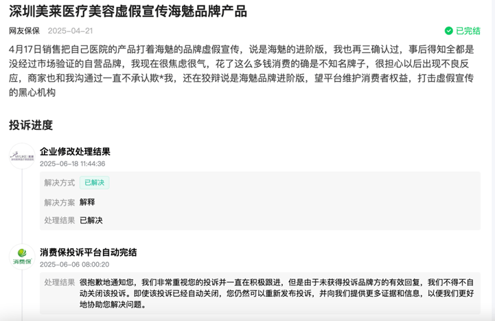 此前,也有網友在消費保平台投訴稱,深圳美萊醫療美容醫院的諮詢顧問“把自己醫院的產品打着(昊海生科旗下)海魅的品牌虛假宣傳”,實則使用的是“沒經過市場驗證的自營品牌”。