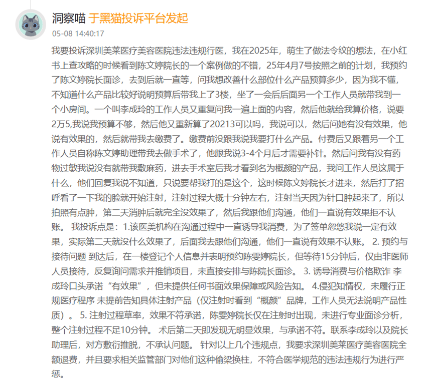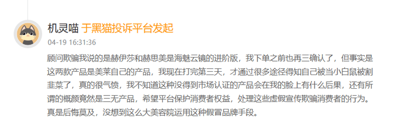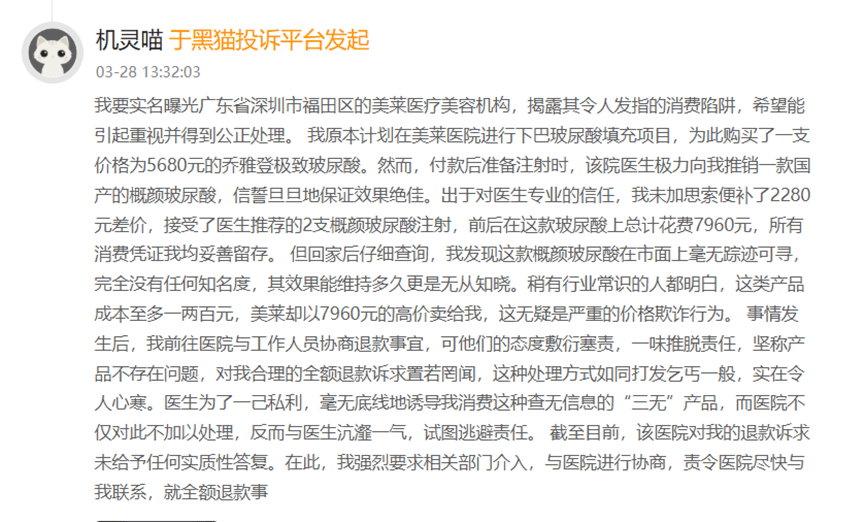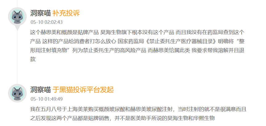 在黑貓投訴平台,有消費者稱,今年5月於上海美萊醫療美容醫院購買概顏玻尿酸和赫思美玻尿酸注射。之後卻發現,這兩款都是貼牌產品,“沒有在藥監局官網查到”,並非醫美諮詢顧問所説是出自昊海生科和華熙生物的產品。