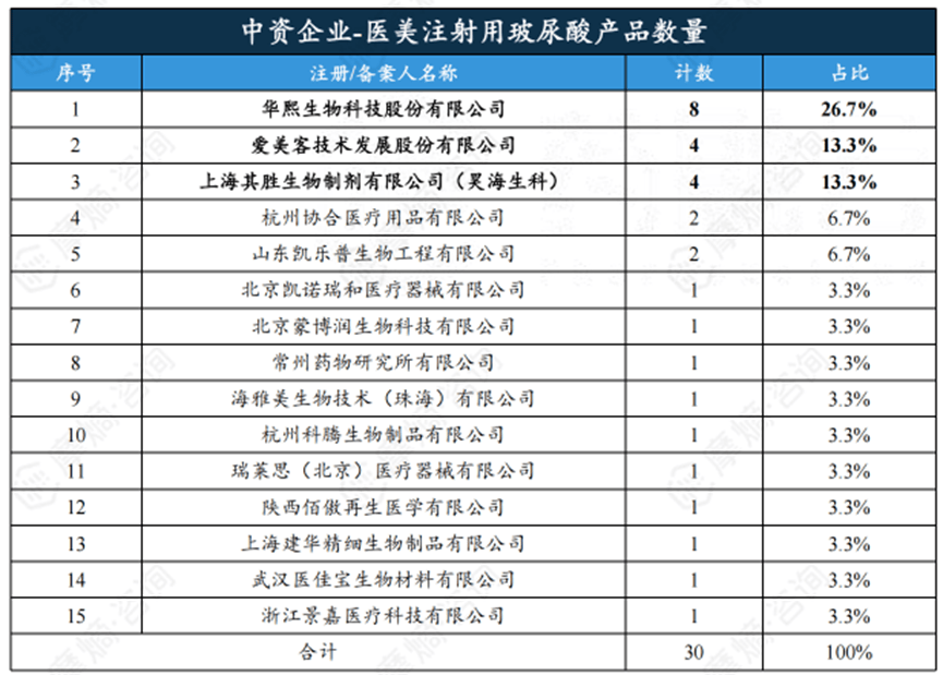 根據摩熵諮詢,截止2024年,中國共有15家本土企業佈局醫美玻尿酸填充劑產品,其中愛美客、華熙生物與昊海生科位列前三。