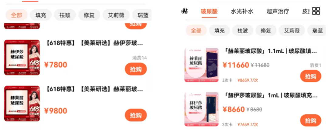 深圳美萊與北京美萊的赫伊莎、赫萊麗玻尿酸價格,圖源:大眾點評APP