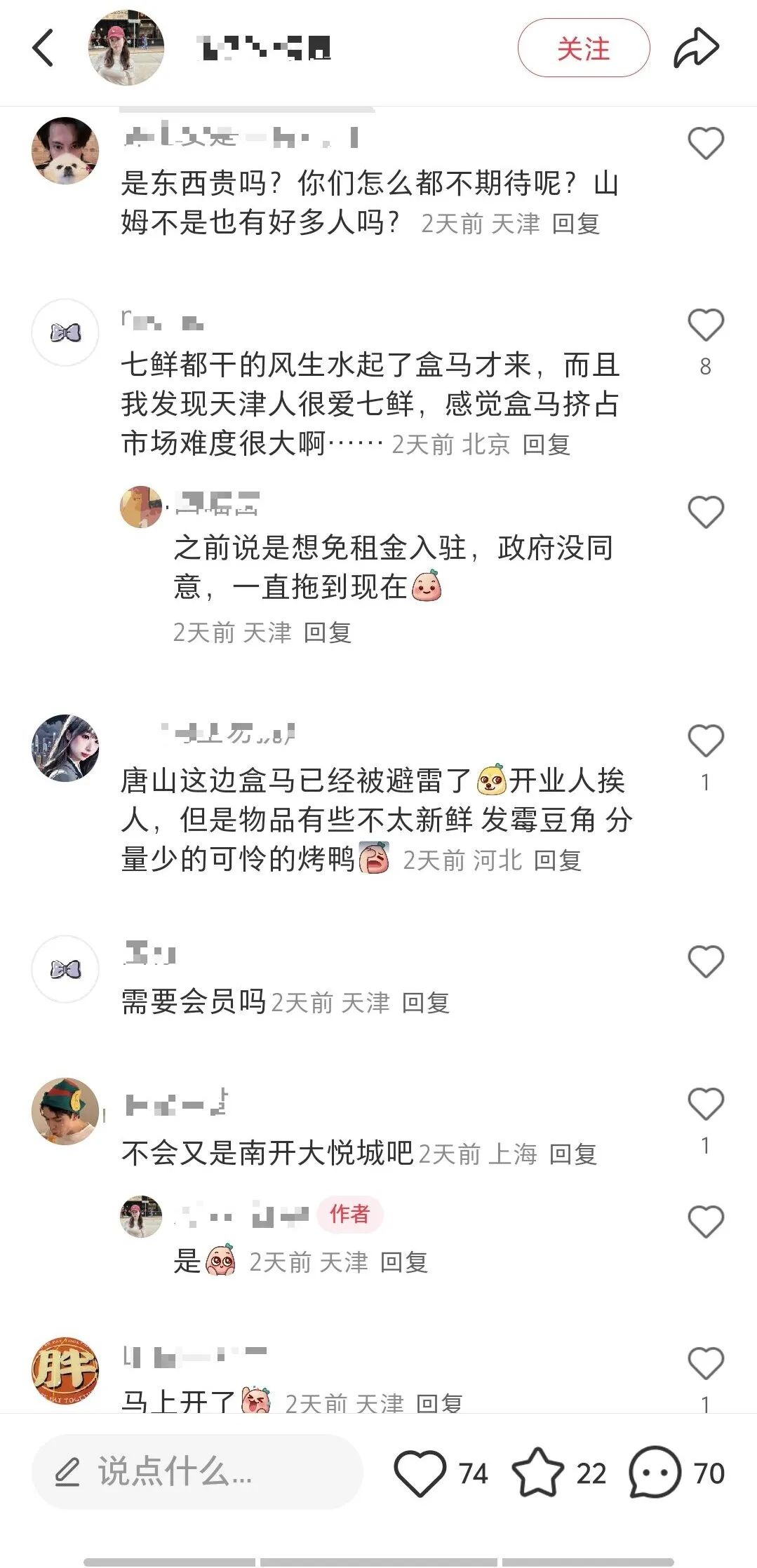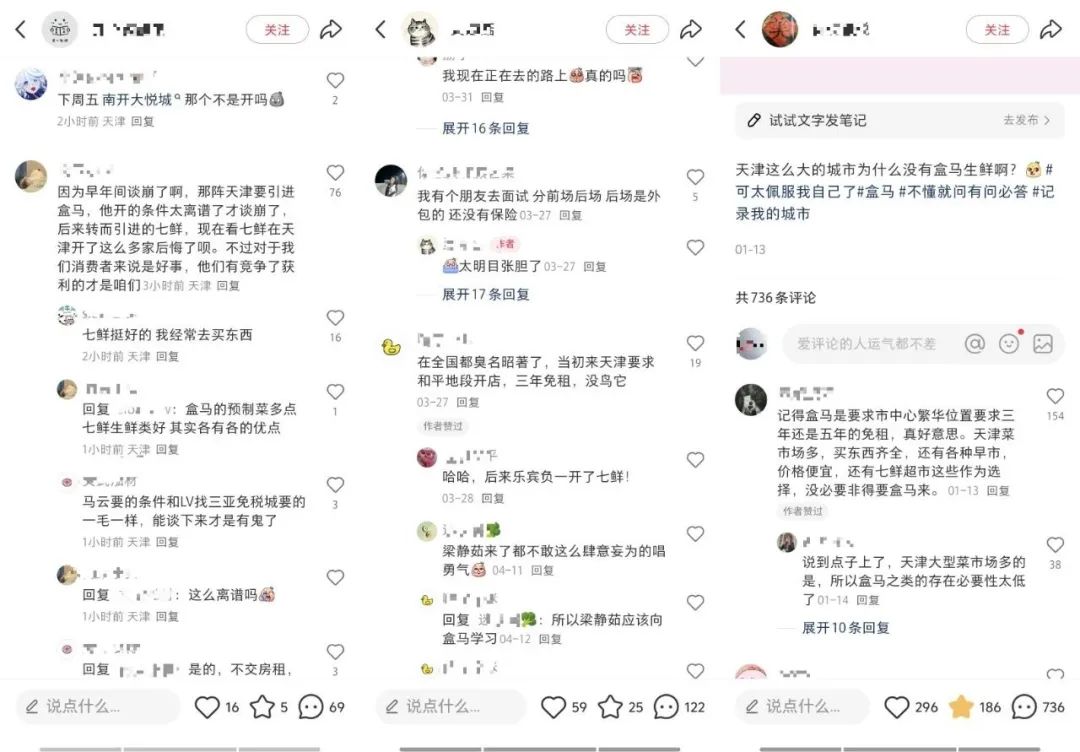 這條帖子,得到了天津700多位網友的評論。事實上,由於盒馬尚未進入天津,這位當地網友甚至還寫錯了名字——正確的應是盒馬鮮生,而非盒馬生鮮。