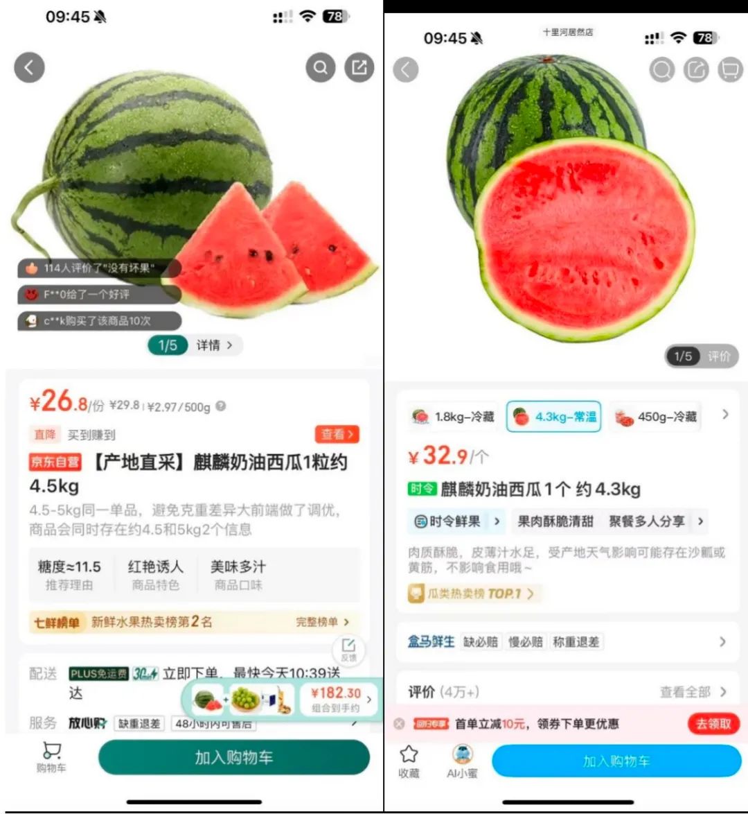 七鮮的麒麟奶油西瓜(4.5kg)29.8元一個,盒馬的價格為32.9元一個(且只有4.3kg);