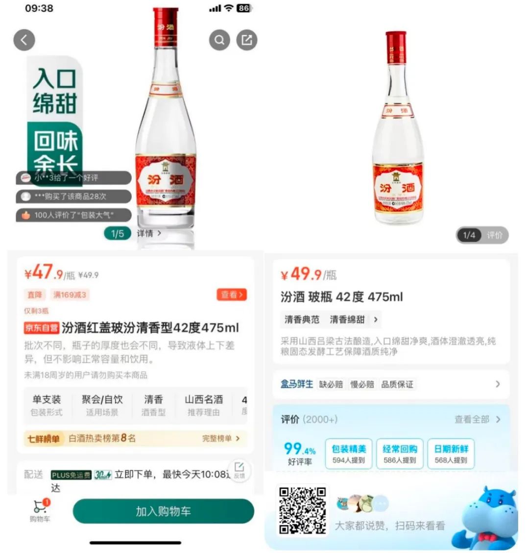 七鮮的汾酒黃蓋玻汾48.9元一瓶,盒馬的價格為53.9元一瓶;