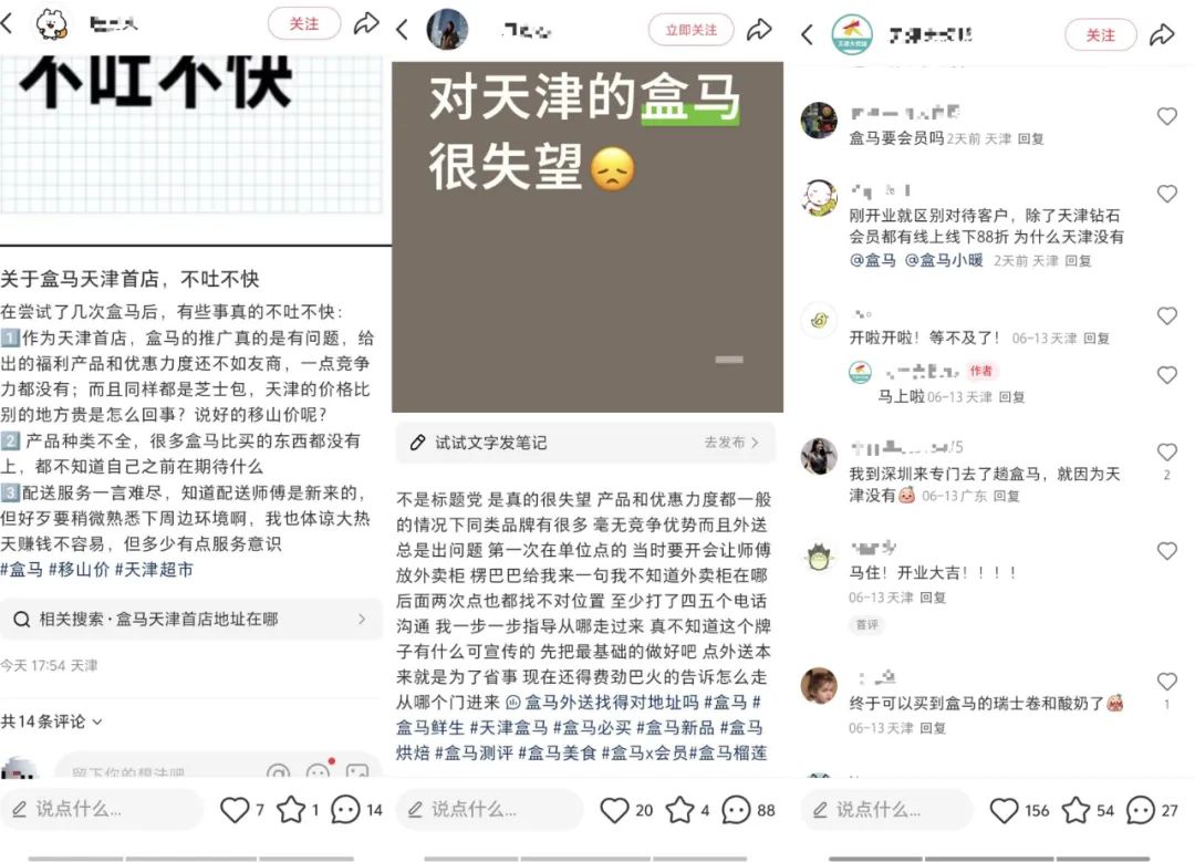 不過,或許是等待太久,或許是6月份倉配送服務的不如預期,從反饋來看,是不少天津居民對盒馬首店的種種質疑和吐槽。