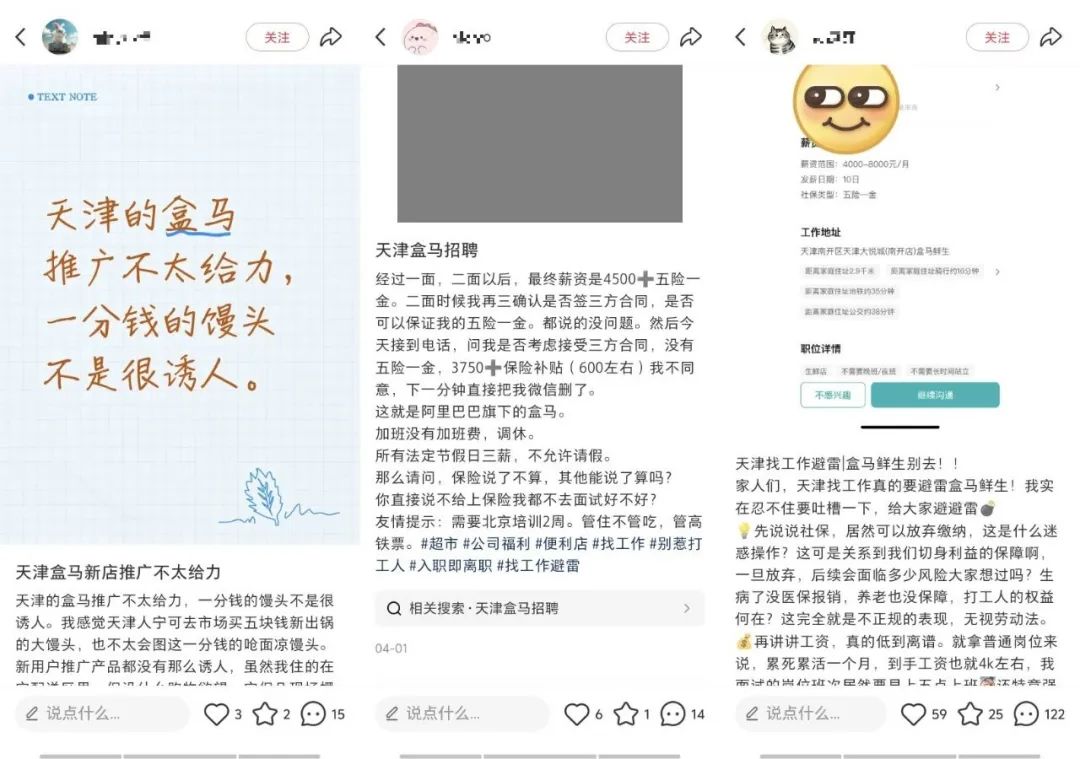 比如,不少求職者在社交平台呼籲,天津找工作需要避雷盒馬,因為除烘焙崗外,大多不會繳納社保,加班沒有加班費;比如前期推廣方式上,展區促銷連價錢都沒有,不收現金;作為天津首店,推廣禮品是一分錢的嗆面涼饅頭,“感覺盒馬對天津還是相當傲慢。”