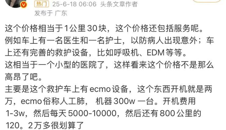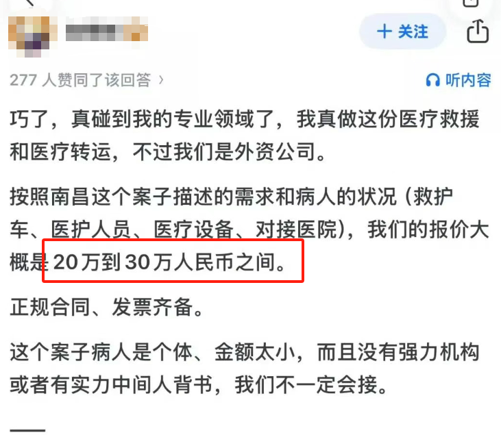 專門幹醫療轉運的人説,這點錢完全就是做慈善的,要是真的按商業項目來報價,至少要20萬起步,而且特殊情況都不接的。