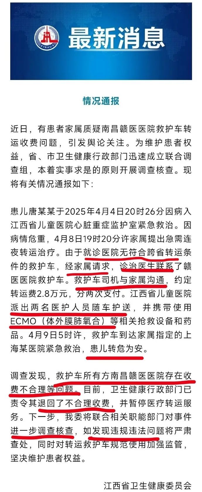 原來當夜的情況是,江西省兒童醫院自己的救護車不符合跨省轉運條件,所以在家屬的請求下,主治醫生幫忙聯繫了其他救護車。
