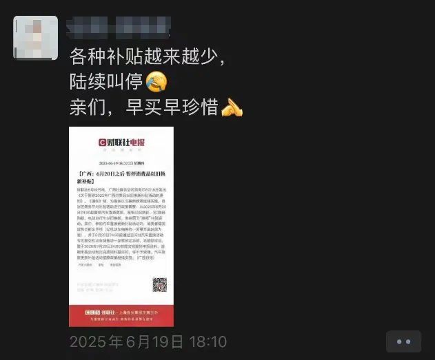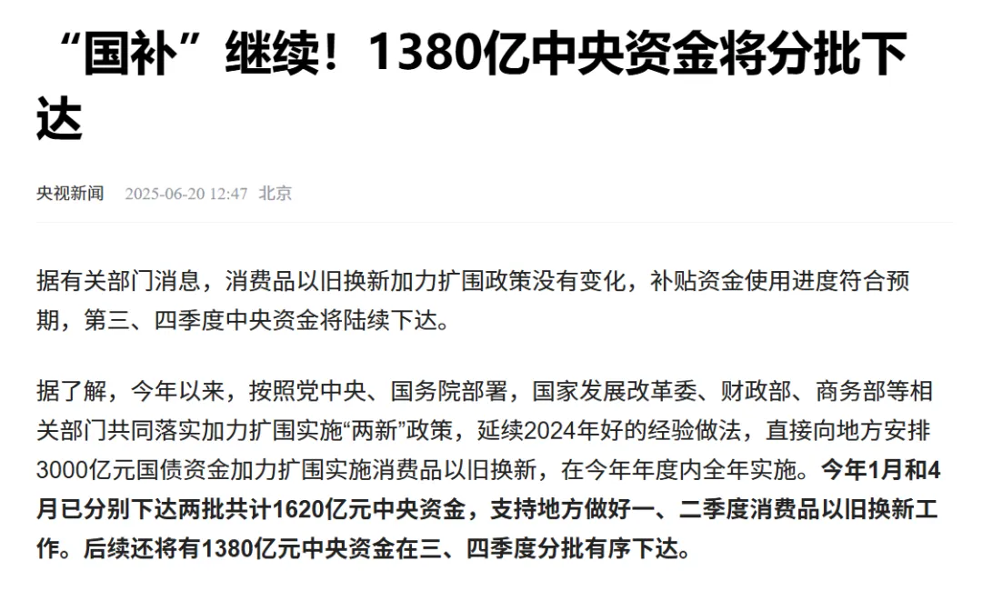 這不,最近央視新聞就已經説了這件事,在第三、四季度,**中央還會再追加補貼 1380 億國債,繼續這個消費補貼計劃,**這會兒的間斷,很可能只是國家走一步看一步的策略,本質上是一件好事。