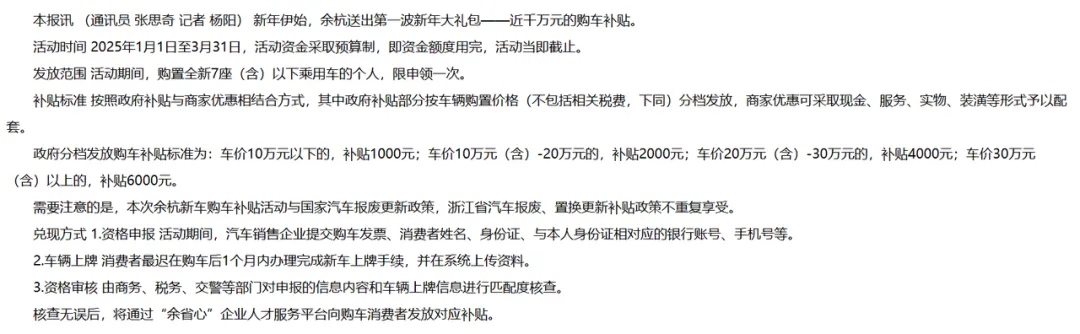 另外呢,還有區級別的補貼,但不是所有區都有,比如在今年1月-3月,杭州餘杭區就有一個新車購車補貼,按照購車價格補貼 1000-6000,和國補地補不能一起用(有的區補也可以一起用)。