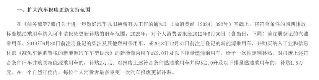 國補是指報廢補貼,在 《商務部等 8 部門辦公廳關於做好 2025 年汽車以舊換新工作的通知》上寫很清楚,符合報廢規定去置換新車,新能源補貼 2 萬,油車補貼 1.5 萬,不僅補的多,而且這個政策要到年底才結束。