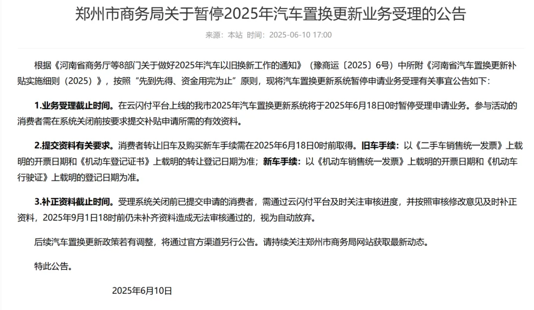 前幾天就有重慶、瀋陽、鄭州、洛陽等好幾個城市都發布了暫停置換更新補貼的通知。比如在河南,鄭州從 6 月 18 號開始暫停了申請窗口,洛陽和許昌分別在 12 、13 號就已經關了。