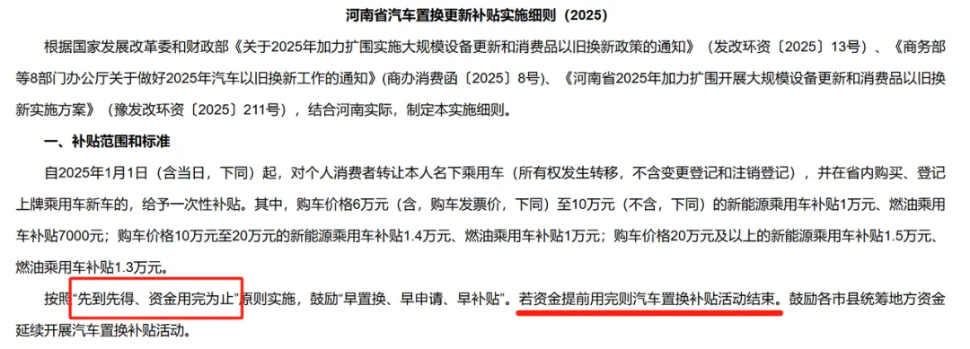 或許你會覺得事發突然,但其實在政策頒佈之初,就寫得明明白白。比如在《河南省汽車置換更新補貼實施細則(2025)》裏就明確規定了**“ 先到先得、資金用完為止 ”**的原則,提前用完就提前結束。