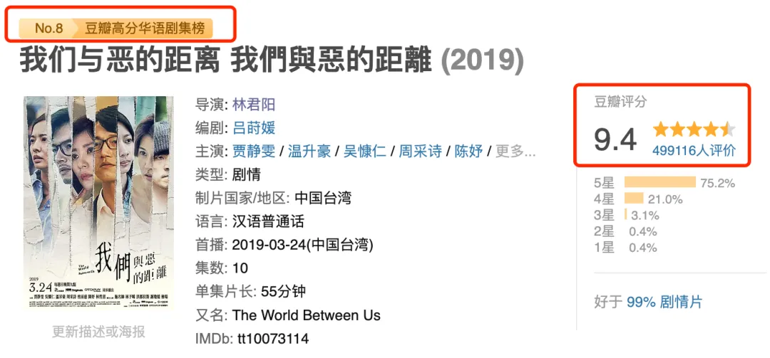 豆瓣評分高達9.4,成為當年評分最高的華語劇。