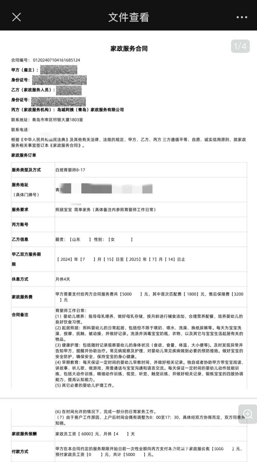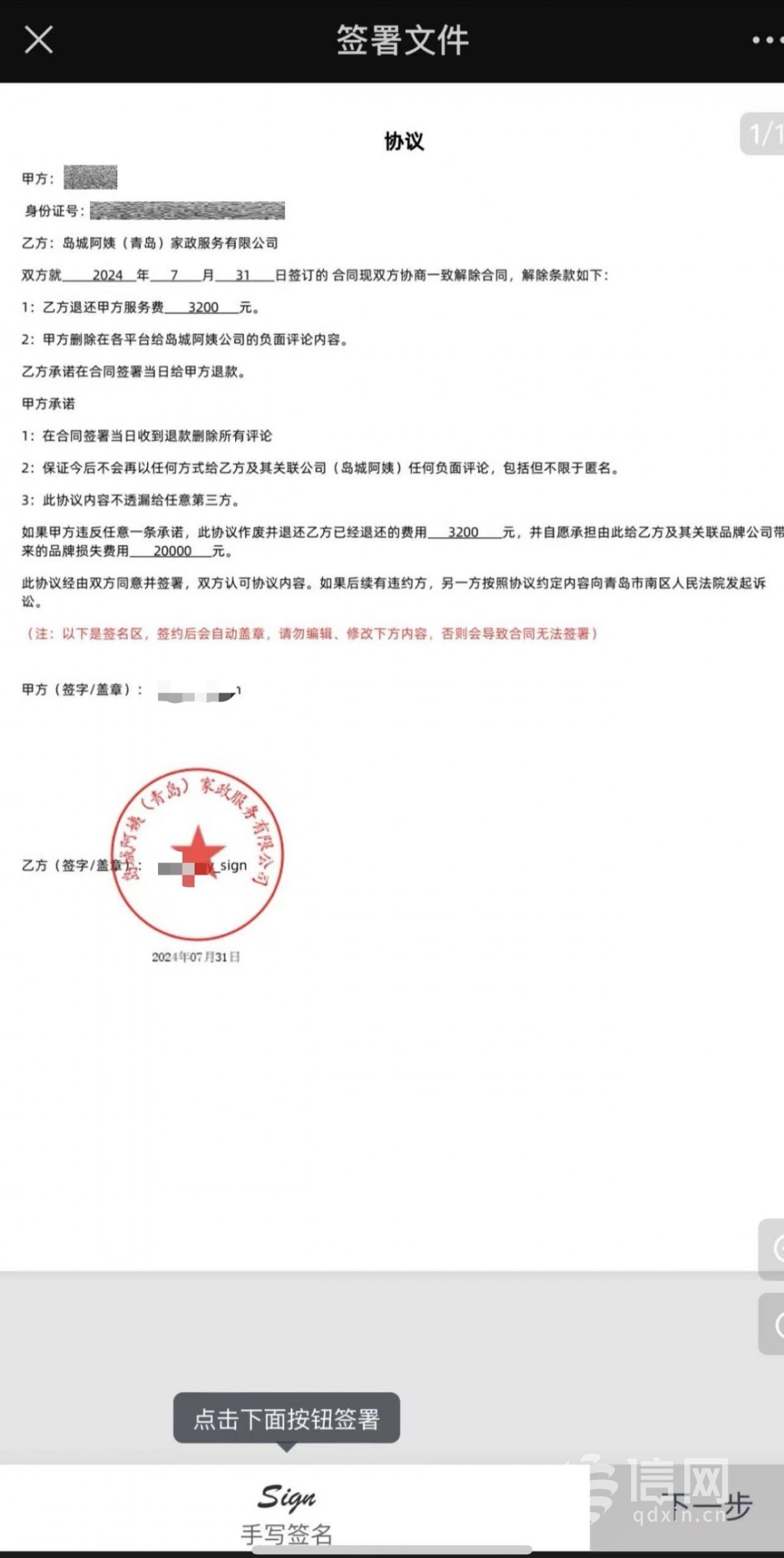 協議內容(來源:受訪者)信網6月26日訊 “本想花錢買個省心,僱傭專業育嬰師照顧孩子,結果四天三換育嬰師都沒匹配成功。”近日,青島市民張女士向信網(熱線0532-80889431)反映,2024年7月,她通過島城阿姨(青島)家政服務有限公司(以下簡稱“島城阿姨”),支付5000元中介費僱傭育嬰師,在四天內遭遇三次服務失敗。當她提出退款時,公司要求其簽署“不得發佈任何負面評價”的保密協議才予以退款。截至發稿,因拒絕簽署該協議,張女士的服務費仍未退還。島城阿姨方面表示,這是公司處理退款流程需要,退款必須籤協議,目的是防止僱主退款後在網上發佈負面言論,只要僱主沒有發佈負面言論的想法,籤協議後就會退款。
