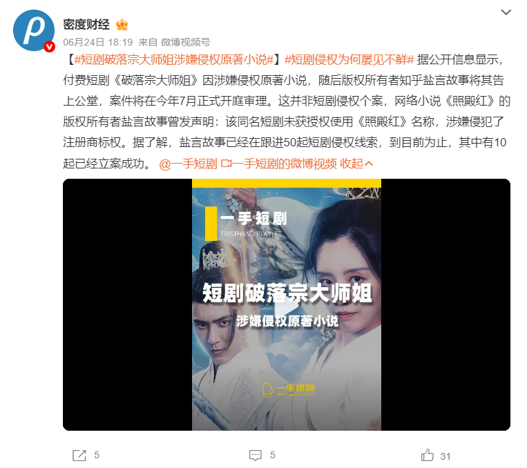 事實上,隨着短劇的爆發,近年來,關於短劇的版權爭議不少。據媒體報道,多平台播放的付費短劇《破落宗大師姐》涉嫌抄襲鹽言故事作品《我不做劍主很多年》。就此事,鹽言故事已向該劇製作方及發行方發起起訴,案件將於2025年7月在杭州正式開庭審理。目前,鹽言故事已在跟進50起短劇侵權線索,其中有10起已經立案成功。