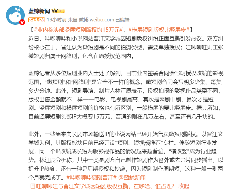 此外,有業內人士表示,**近幾年網絡微短劇的改編權也已經被“單拎”出來。**授權拍攝的影視作品類型不同,版權出售金額就不一樣——電影、電視劇最高,其次是網劇中劇,最次才是短劇。短劇中,也分豎屏短劇和橫屏短劇。目前豎屏短劇頭部IP版權大概要15萬元,普通的則在幾萬左右,甚至還有幾千塊的。