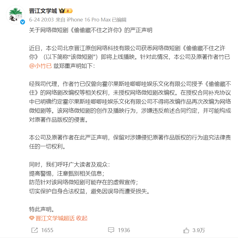 6月24日和25日,晉江文學城連發兩則聲明,指控哇唧唧哇未經授權將《偷偷藏不住》改編為網絡微短劇,並稱已進行證據保全,將依法追究相關責任方的法律責任。