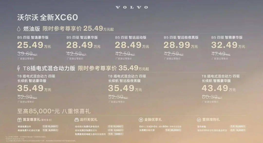 6月26日,沃爾沃汽車在成都品牌體驗中心舉辦了“沃爾沃安全小劇場探訪之旅暨全新XC60上市發佈會”,新北歐豪華SUV——沃爾沃全新XC60迎來正式上市,共推8款車型。其中燃油版共帶來5款配置車型,售價區間為39.69-47.49萬元,限時參考尊享價25.49-32.49萬元。此外,T8插電式混合動力版共推出三個配置版本,官方指導價52.39-60.39萬元,限時參考尊享價35.49-43.49萬元。其中插混版百公里綜合油耗僅2.46L(WLTC工況),綜合續航里程可以達到1360公里(CLTC工況)。