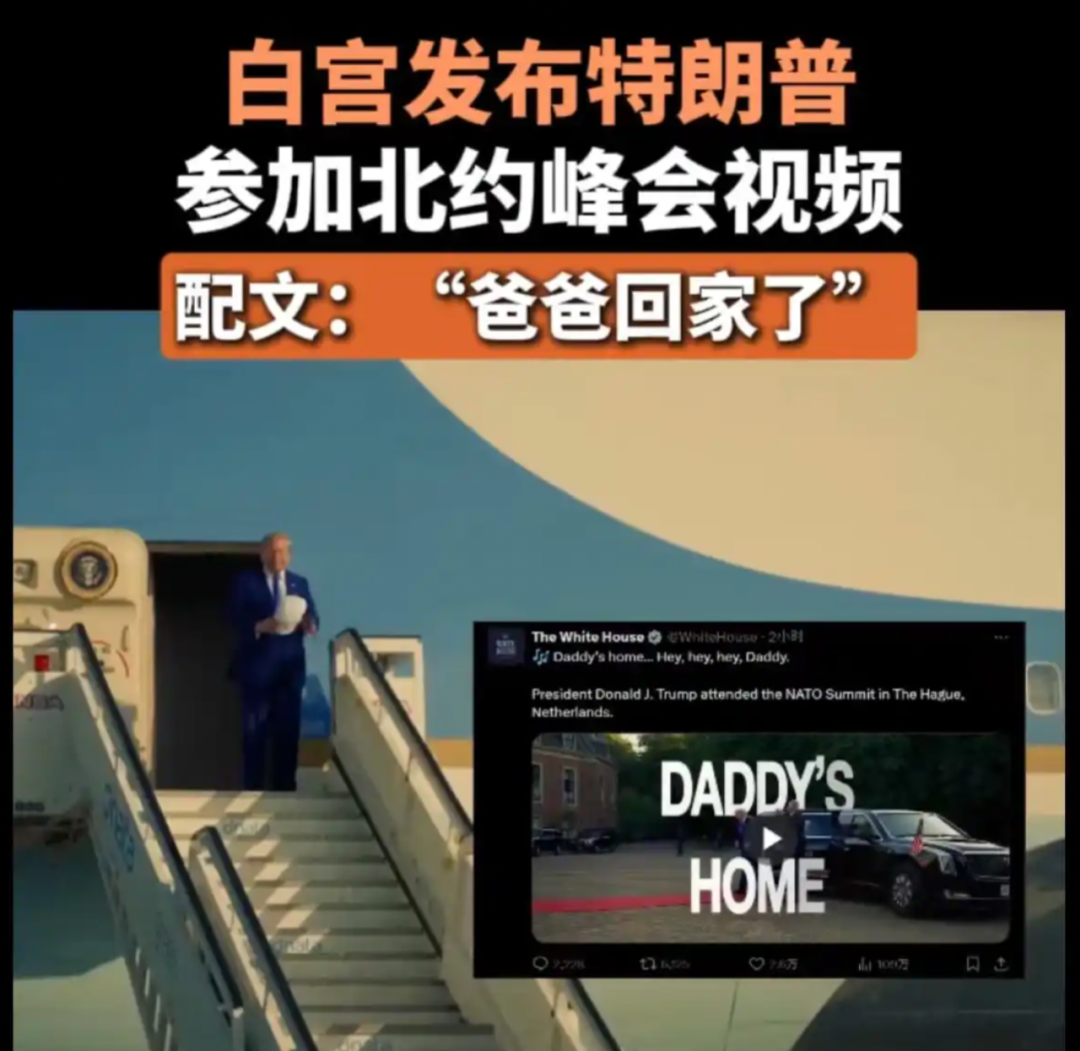 白宮也是會整活兒的。他們發佈了一段特朗普參加北約峯會的視頻,配樂和字幕很醒目:“爸爸回家了(Daddy’s home)。”