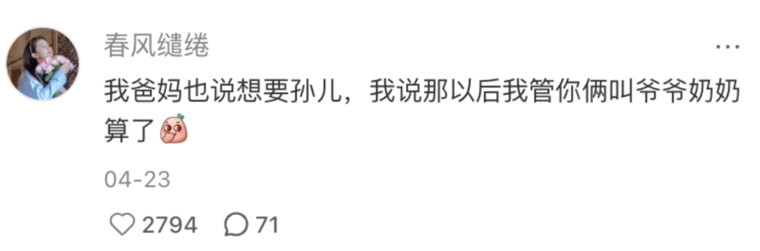 父母催婚説來説去就那幾句,比較經典的就是“我年紀大了想抱孫子了”。此話一出,很多網友見招拆招,甚至給父母的職業規劃提出了新思路。