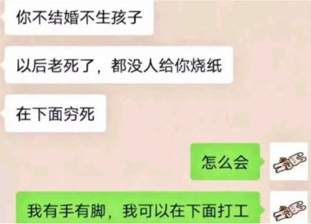 現在年輕人都非常獨立,不需要靠找對象來讓自己的生活更幸福。而父母總是會擔心,如果現在不結婚生子,老了都沒人燒紙。