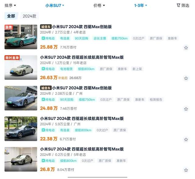 事實上,除了被各種炒賣的訂單和準新車,將視野拓寬到主流二手車市場,小米SU7依然很神。據源Auto梳理,目前市面上1年車齡、3萬公里以內行駛里程的二手小米SU7,普遍折價幅度在3萬元左右,其中頂配的小米SU7 Max折價會稍高,是中國汽車流通協會認定的1年車齡純電動車型保值率TOP 1。