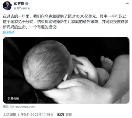 早在2023年1月,還是參議員的萬斯就評價過類似的生育支持政策,他在社交平台X上支持分娩免費,暗示美國向烏克蘭援助的資金可以“結束那些摧毀新生兒家庭的意外賬單,並可能挽救許多新媽媽的生命”。