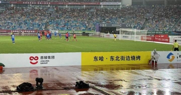 但是就在前幾天常州對戰南京的比賽中,在場邊一眾大牌的知名贊助商中,突兀的出現了一個沒有任何logo和設計的廣告牌:東哈·東北街邊燒烤。
