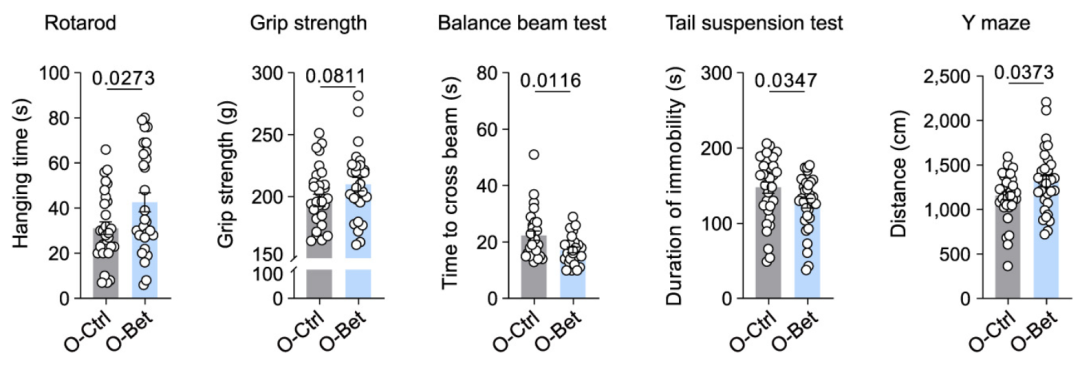 圖注:補充甜菜鹼後,老年小鼠的耐力、抓力、平衡能力和認知水平得到改善