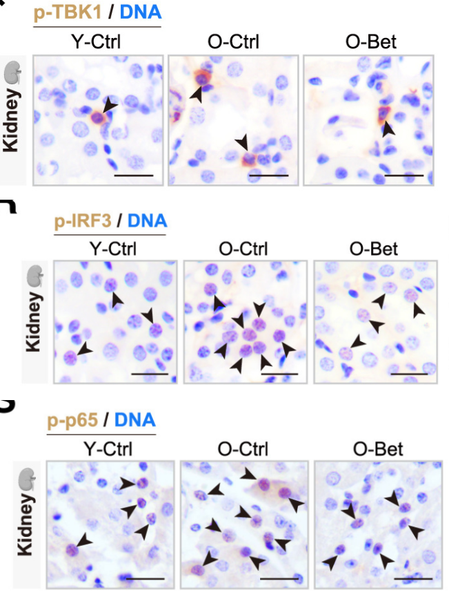 關於機制,研究者發現,它抑制了一個關鍵的促衰促炎的蛋白——TBK1的活性。在老年小鼠的腎臟中,TBK1及下游的“炎症分子”p-IRF3、p-p65活性,在補充甜菜鹼後都被壓制了下去。