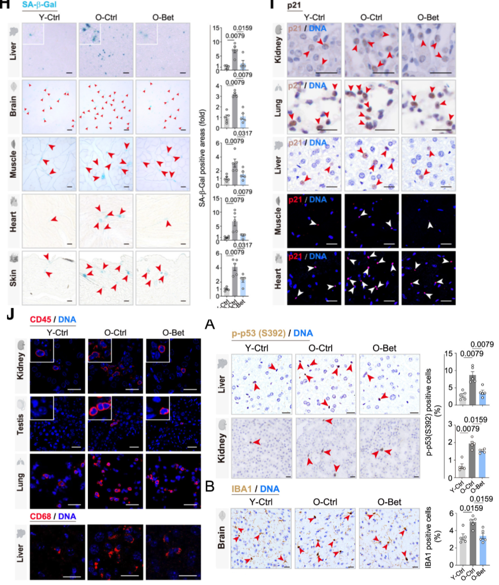 整體看,小鼠補充了甜菜鹼後,不論是皮膚、肝臟、肌肉還是腎臟等多個組織,代表細胞衰老的標誌物SA-β-Gal高表達的區域顯著減少;在肝臟和腎臟中,高表達驅動細胞衰老的p53和p21蛋白細胞的數量也顯著減少。