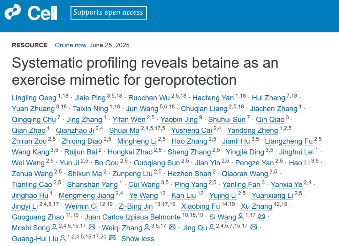 [本文的名稱是《Systematic profiling reveals betaine as an exercise mimetic for geroprotection》,發表於《Cell》期刊,通訊作者是中國科學院動物研究所的劉光慧、中國科學院北京基因組研究所的張維綺、中國科學院動物研究所的曲靜、中國科學院動物研究所的宋默識以及首都醫科大學宣武醫院的王思。第一作者是Lingling Geng、Jiale Ping 和 Ruochen Wu。本研究資助來源:國家自然科學基金(82125011, 82488301, 82361148131, 82422031, 82322025, 82371570)、非傳染性慢性疾病國家重點研發計劃(2024ZD0530400)、國家重點研發計劃(2020YFA0804000 和 2022YFA1103700)、STI2030 重大項目(2021ZD0202400, 2021YFA1101401, 2022YFA1103800, 2023YFC3605400, 2022YFC3602503, 2022YFA1104701, 2023YFC3504301)。]