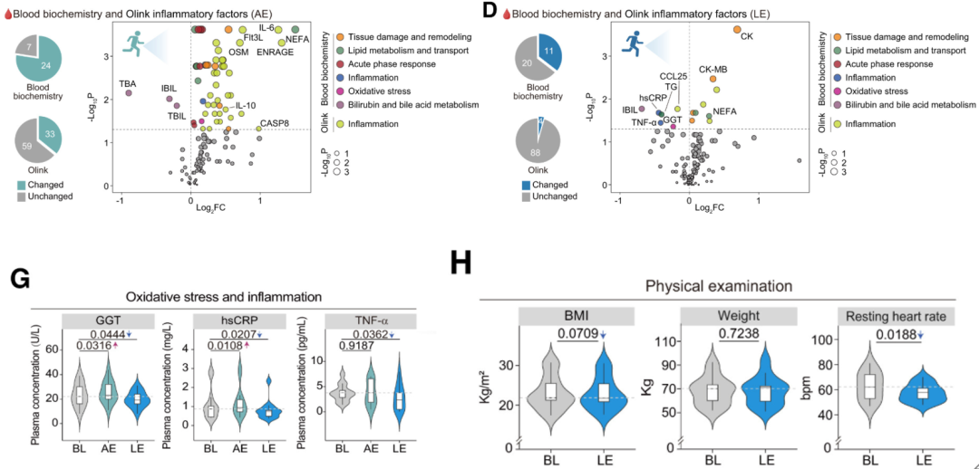 圖注:長期運動使多項健康指標得到改善,如靜息心率下降、炎症因子hsCRP和TNF-α水平降低,而急性運動則主要引起身體指標的短暫應激性變化