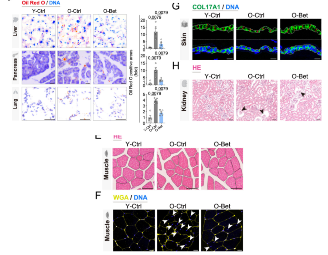 圖注:老年小鼠補充甜菜鹼後,多個組織中SA-β-Gal、p21和p53水平均顯著下降,同時代表炎症的免疫細胞浸潤也明顯減少