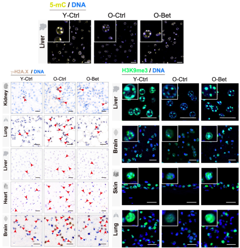 圖注:甜菜鹼降低了老年小鼠中γ-H2A.X的水平,同時提升了H3K9me3和5-mC水平