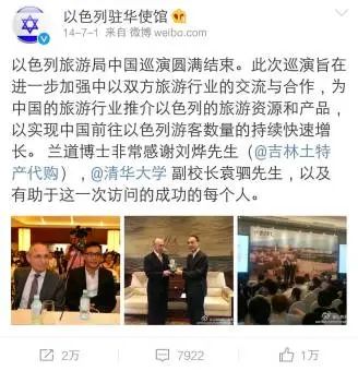 他和以色列駐華大使、旅遊部部長一同出席活動,官方在一條非常嚴肅的微博上@“吉林土特產代購”,大家還以為@錯了賬號。