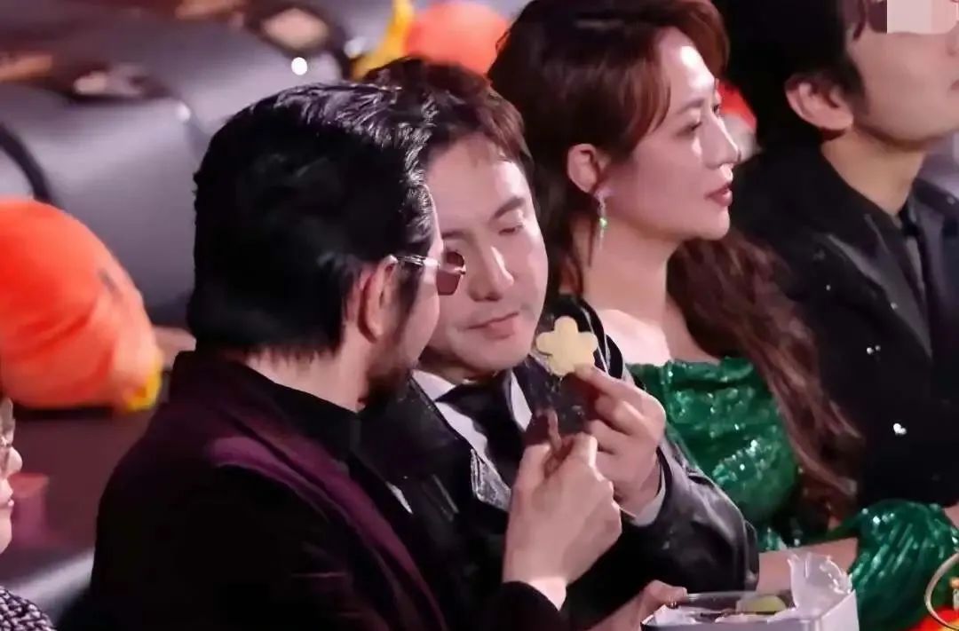 接下來他並沒有就此停嘴,反而裝都不裝了,不僅自己堂而皇之地吃,還給身旁的明星們分發餅乾,還和費翔用餅乾“乾杯”。