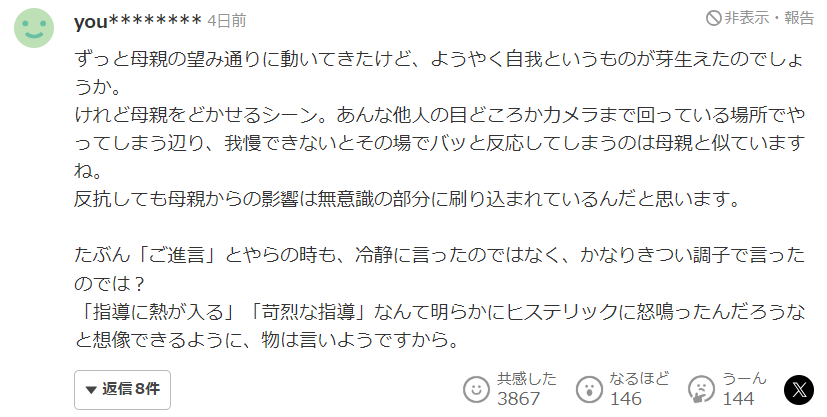 網友有網友的觀點,專家也有專家的看法。家庭問題專家認為悠仁正處於青春氣核心階段,在公開場合反駁母親,反映出他對自身認知中的正確性與母親行為之間的差異有所察覺;也許這正是一個嘗試對孩子“放手”的好機會。