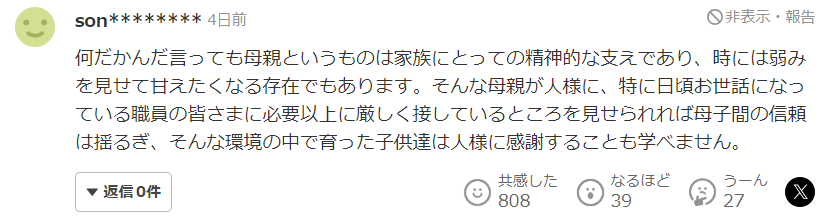 不管怎麼説,母親這個角色對於一個家庭而言,本應是精神上的依靠,是在某些時候可以展露脆弱、讓人想要依賴的存在。紀子妃這樣的母親,在外人面前、尤其是對平日裏一直照顧自己的工作人員表現出過分嚴厲的態度,那麼母子之間的信任也就會因此動搖。而在這樣的環境中成長起來的孩子們,自然也就難以學會對他人的感激之情。
