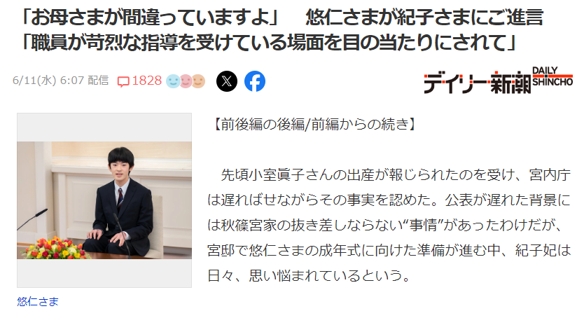 知情人士還透露,紀子妃一直以來都全身心投入到悠仁這個未來皇位繼承人的教育中,事無鉅細地照料兒子的生活,過度的干涉讓悠仁產生了一定牴觸情緒,身心上都渴望跟母親保持一定距離。