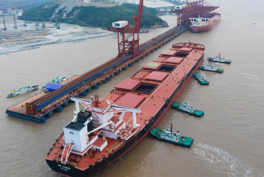説起礦石碼頭,不得不提到的是貨物吞吐量第一大港——寧波舟山港。寧波舟山港鼠浪湖碼頭是全球唯一具備雙40萬噸離島作業能力的自動化散貨碼頭,全球在航的68艘40萬噸礦船均曾在此停靠,2024年11月21日兩艘40萬噸級礦砂船“阿空加瓜”與“礦石天津”輪同步靠泊鼠浪湖礦石中轉碼頭,完成雙船同靠接卸作業,寧波舟山港因此成為全球首個實現雙40萬噸世界最大礦船同靠接卸的港口。