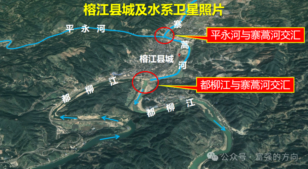 如圖所示,榕江縣城位於羅家山東側的河灘之上,最大的水系特點,那就是“雙重兩江交匯”。縣城的北面,平永河、寨蒿河交匯之後向南流,在縣城的南側再與貴州第一大江——都柳江交匯。